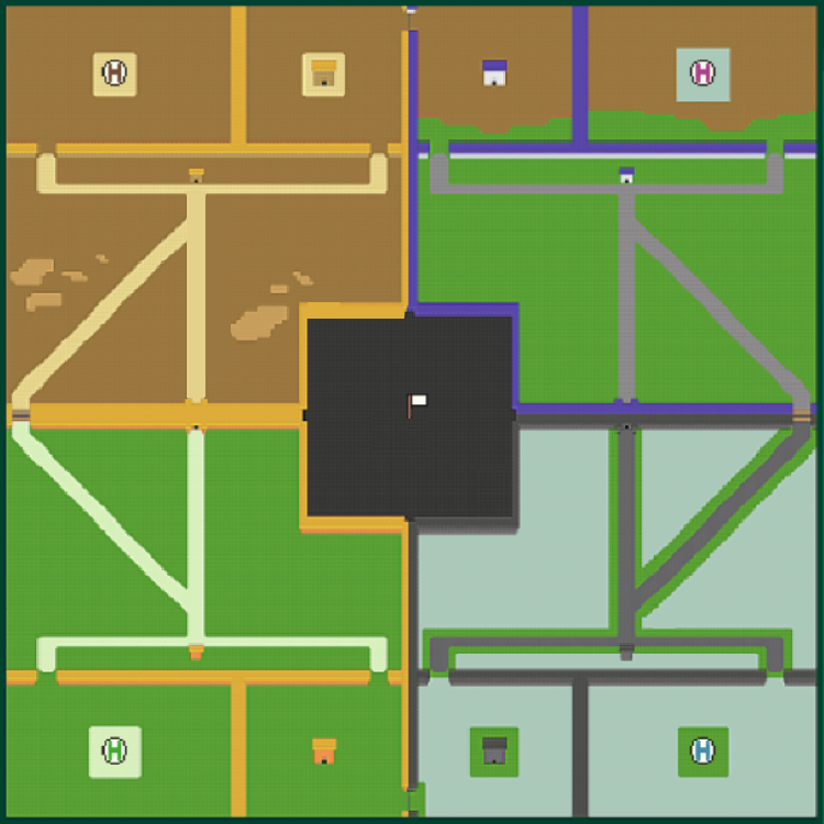 The war takes place on a specialized map divided into four quadrants (one for each village).